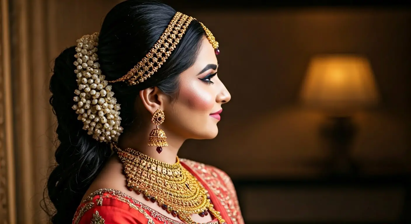 Bridal makeup showcase with traditional Indian jewelry and radiant bridal attire
